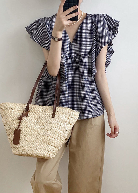 Süßes kariertes Baumwollhemd mit V-Ausschnitt und Schmetterlingsärmeln QB007