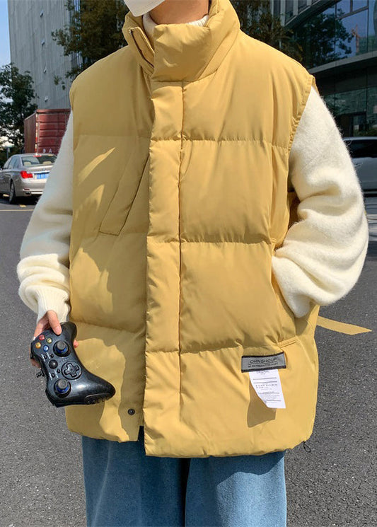 Simple Beige Stand Collar Pockets Cotton Filled Men Waistcoat Winter EQ028