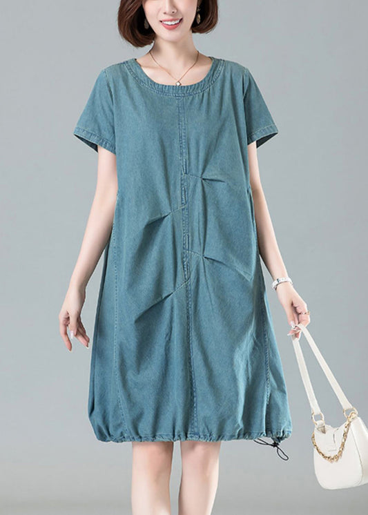 Hellblaue Taschen Denim Kleider O Hals Kurzarm MN086