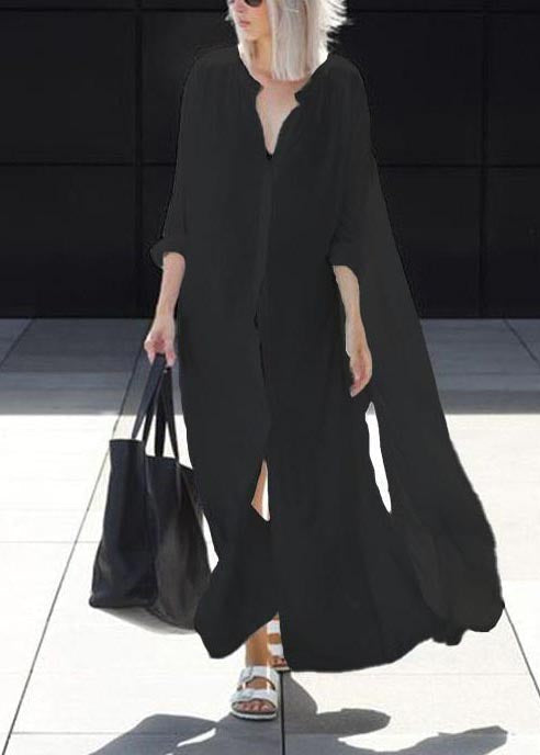 Wrinkled Summer Neck Chiffon Dresses V Long Pockets Black
