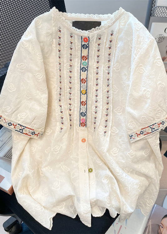 Stand Summer Wrinkled Fine Blouse Cotton Top White Collar