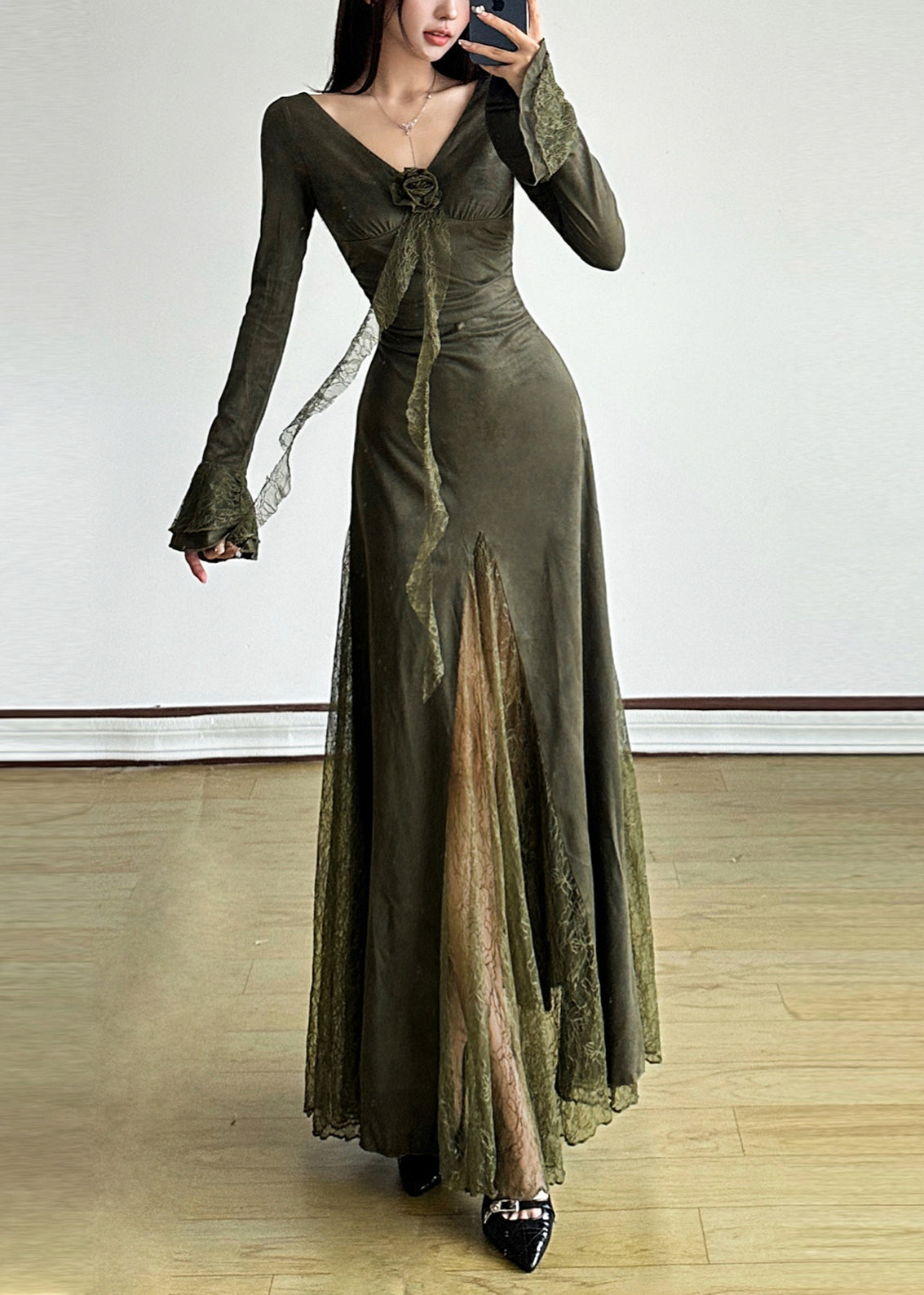 Indulge in the opulent allure of our Elegant Blackish Green Patchwork Lace Long Dress, featuring mesmerizing lace details and a flattering flare sleeve design. This dress exudes an air of sophistication and exclusivity, making it the perfect addition to your wardrobe.
