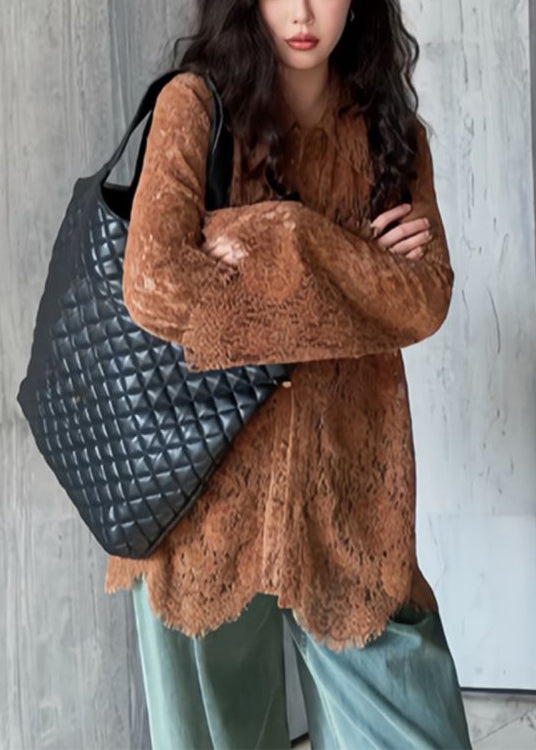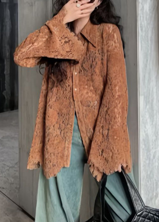 Indulge in the luxurious elegance of Fashion Coffee's Peter Pan Collar Lace Shirts Top, featuring flared sleeves that add a touch of sophistication to any outfit.