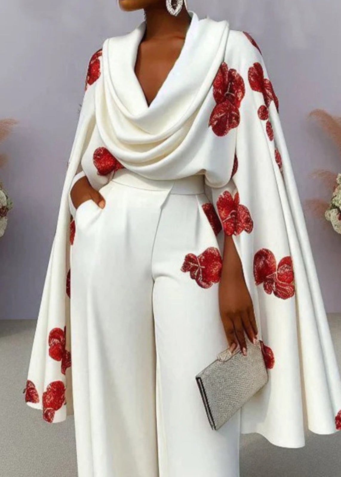Unique White Neck Tops Turtle Cloak Sleeves Print Cotton