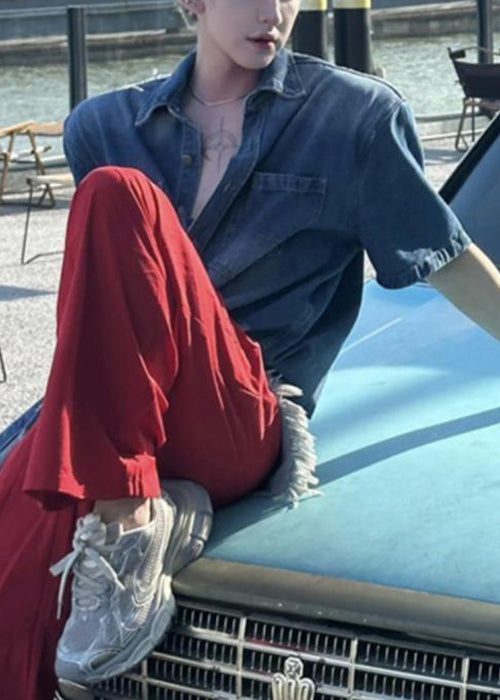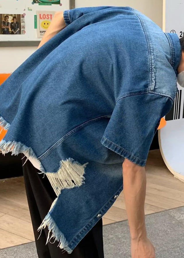 Vintage Button Denim Shirts Summer Men's Blue Hole
