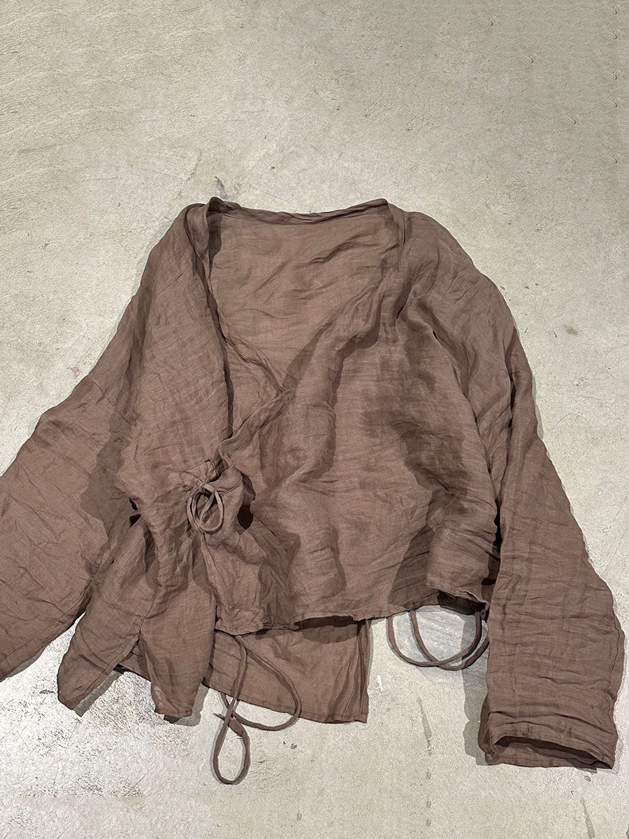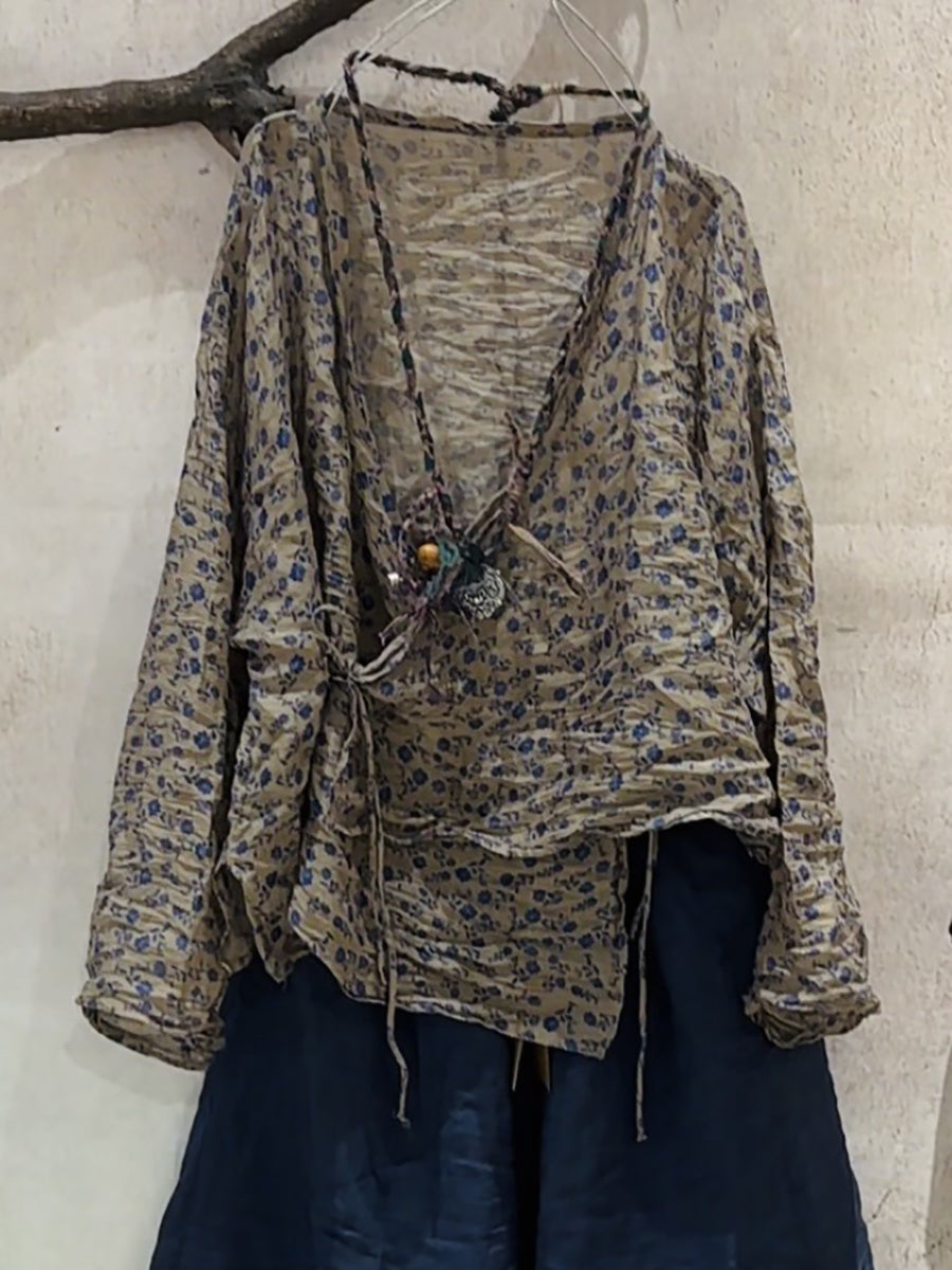 Vintage Shirt Stripe Floral Summer V-Neck Women Ramie
