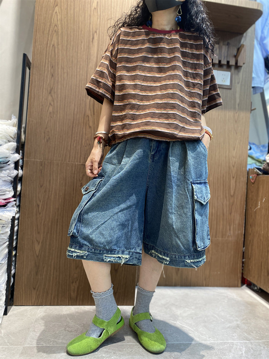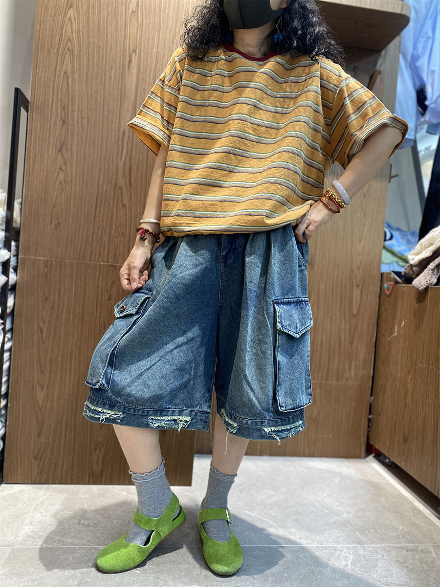 Women Cotton Stripe Retro O-Neck Summer Shirt
