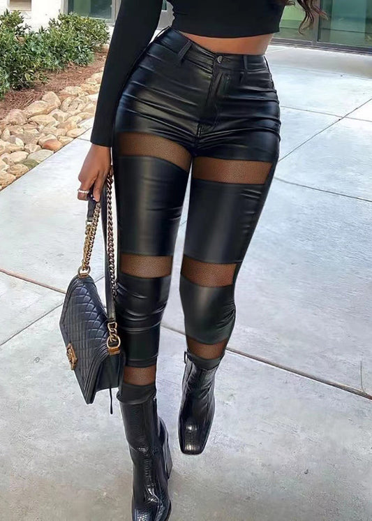 Control Tummy Vintage Faux Black Leather Patchwork Pants Spring
