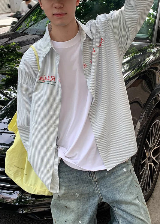 Cotton Men Shirts Striped Collar Blue Letter Spring Peter Pan