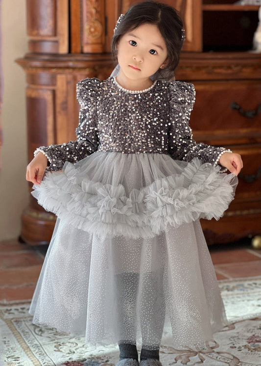 Cute Red O-Neck Sequins Patchwork Nail Bead Tulle Girls Maxi Dresses Fall RP028