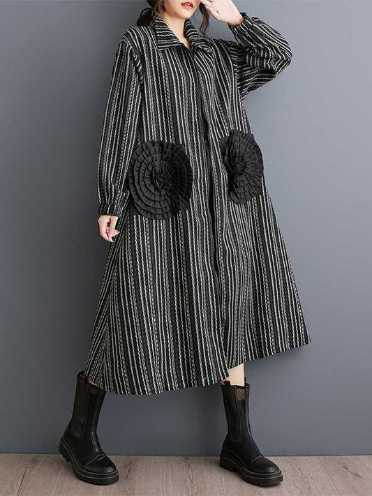 Design Schwarzes Revers Blumentaschen Gestreiftes Kleid mit langen Ärmeln und Reißverschluss WS010
