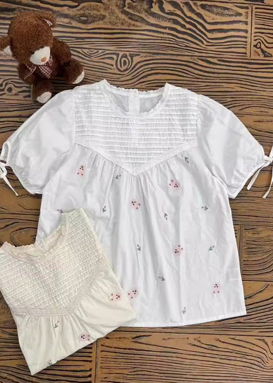 Beige Wrinkled Fine Shirt Summer Embroidered Cotton