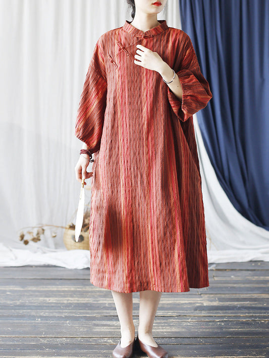 Frauen Sommer Vintage Blume Schnalle Stehkragen Ramie Kleid LL010