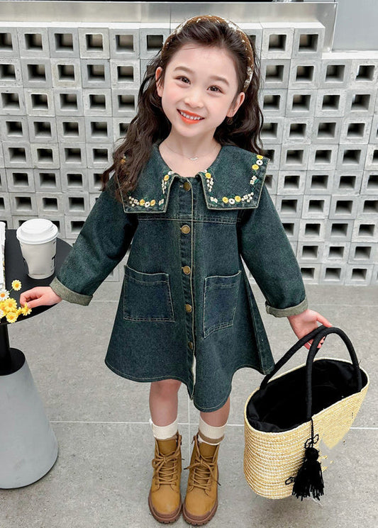 Boutique Denim Blue Peter Pan Collar Patchwork Pockets Kids Maxi Dresses Spring TV034