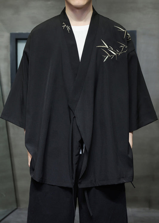 Schwarzes Baumwollhemd mit Schnürung für Herren, V-Ausschnitt, Fledermausärmel, YT072