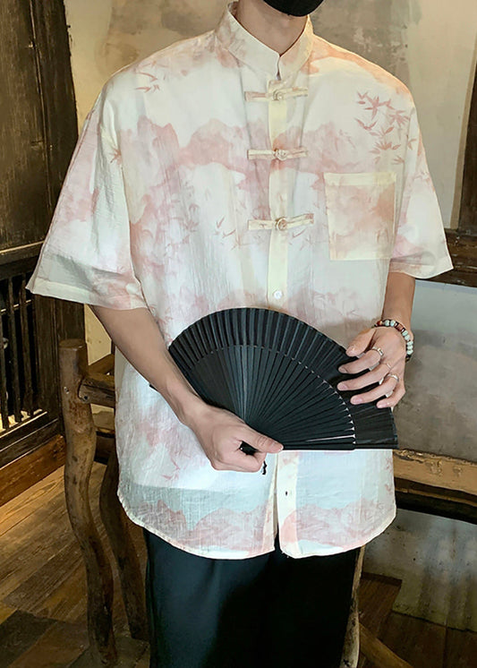 Cooles rosa Button-Print Ice Silk Herrenhemden Halbarm YT083