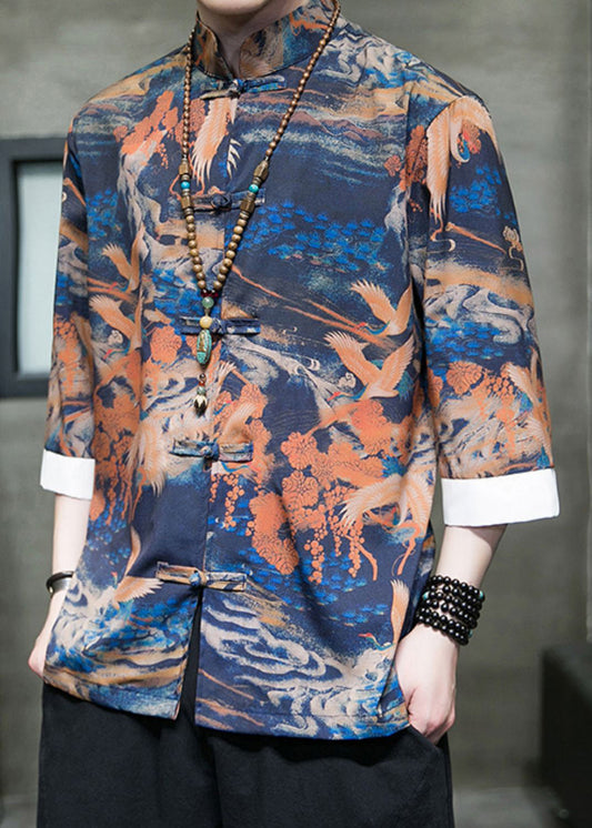Neue blaue Stehkragen Print Ice Silk Herrenhemden Armband Ärmel YT086