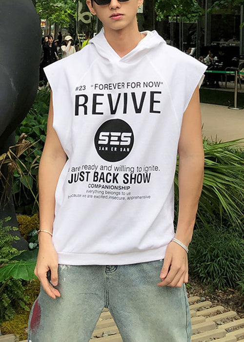 Sleeveless Loose Khaki Mens Letter Cotton Hooded Tanks