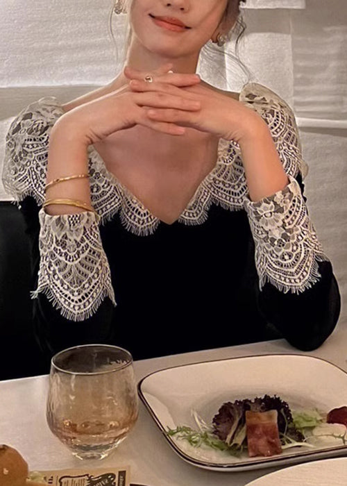 Velvet Neck Silk Lace Dresses Spring French V Patchwork Black