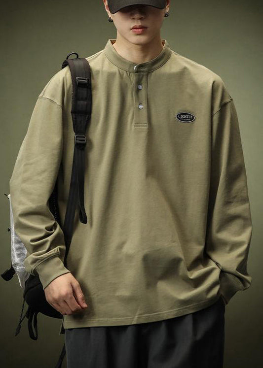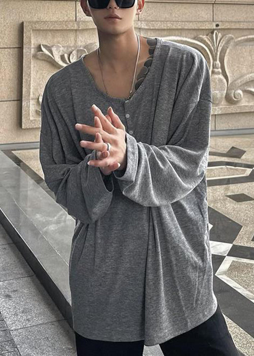Solid Spring Men T Button Shirts Neck Grey Loose Cotton O