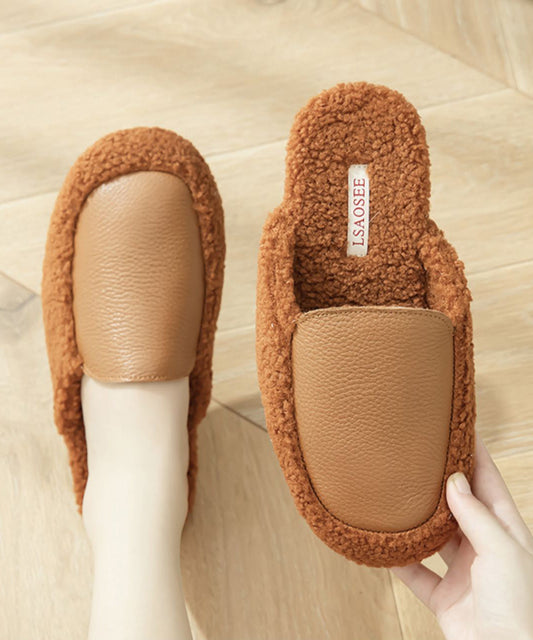 Khaki Comfy Slippers Shoes Splicing Fuzzy Wool Lined TP005