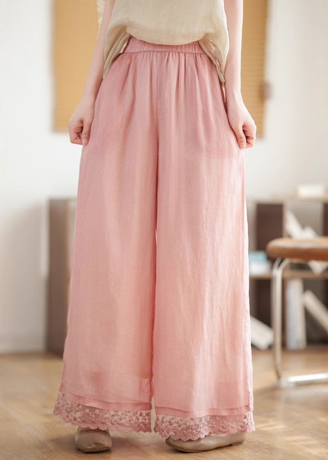 2025 New Black Lace Patchwork Elastic Waist Linen Wide Leg Pants Summer