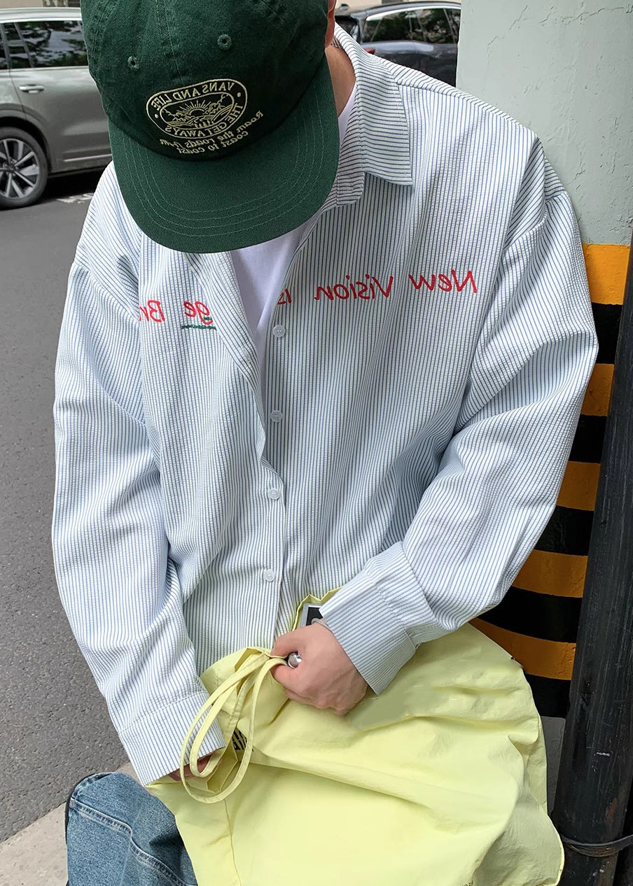 Cotton Men Shirts Striped Collar Blue Letter Spring Peter Pan
