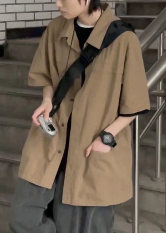 Vintage Brown Button Pockets Solid Cotton Mens Shirt Summer