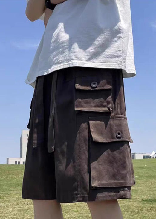 Vintage Brown Pockets Elastic Waist Cotton Mens Shorts Summer