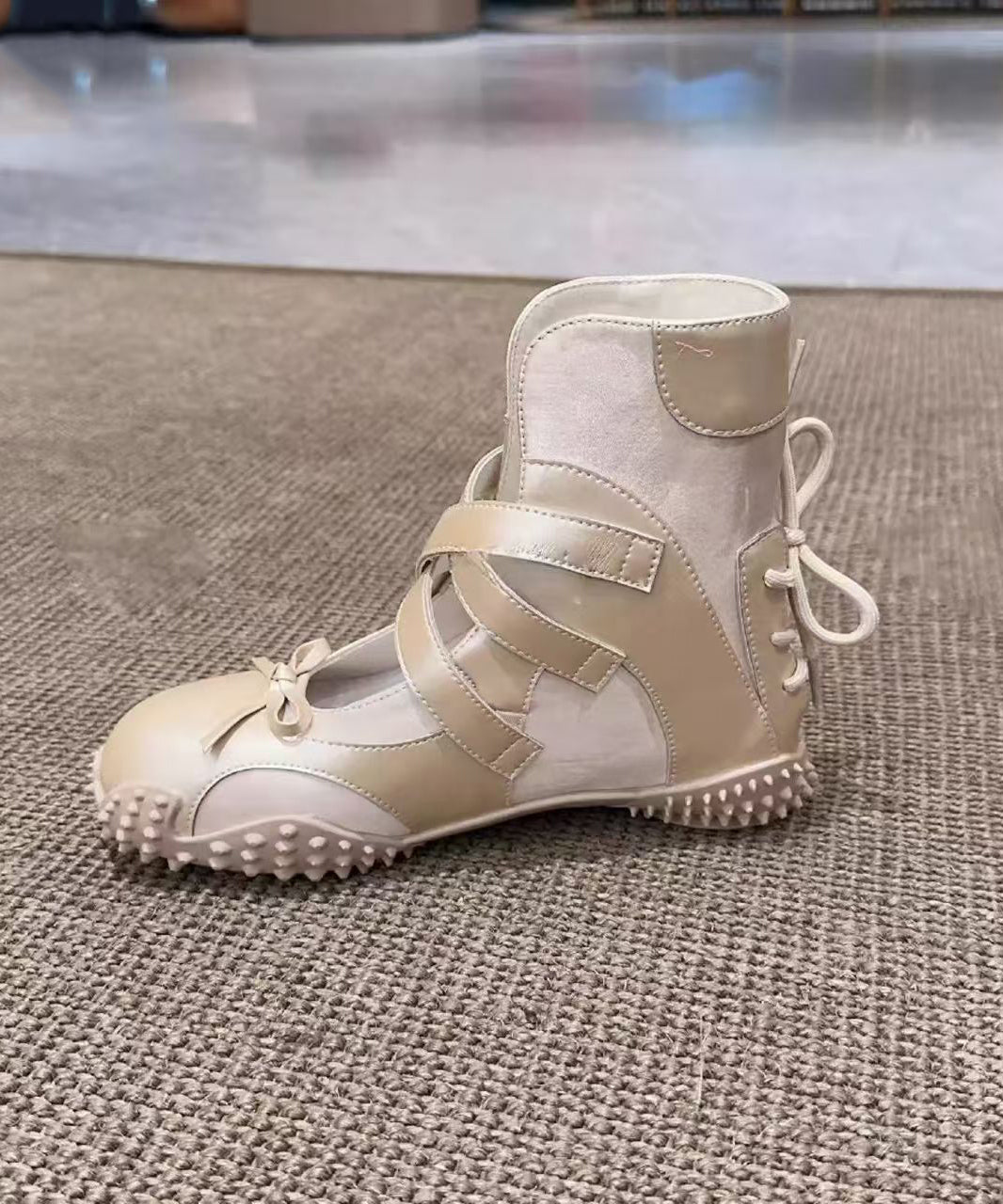 Fashion Bow Lace Up Splicing Flats Shoes Nude Faux Leather