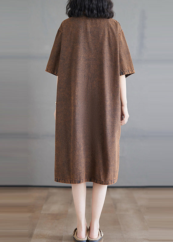 Vintage O-Neck Button Side Open Denim Long Dresses Short Sleeve