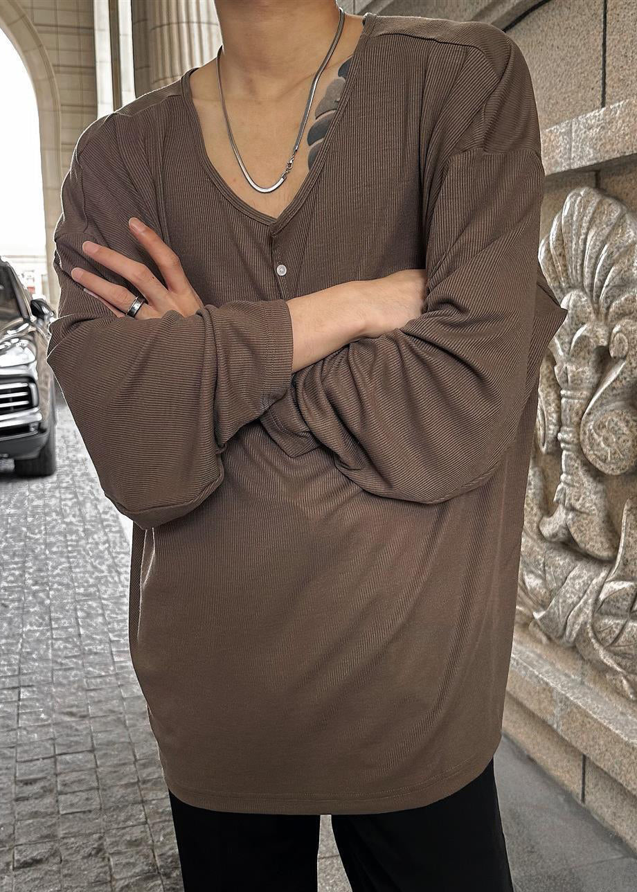 O T Button Neck Simple Spring Solid Coffee Mens Cotton Shirts