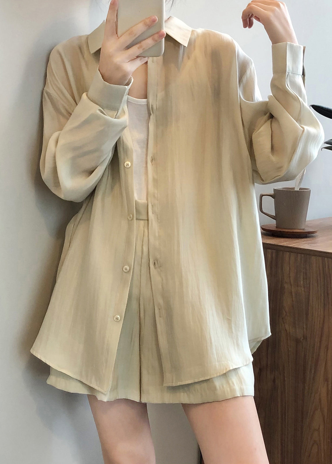Women Light Green Lace Up Solid Silk Two Pieces Set Spring