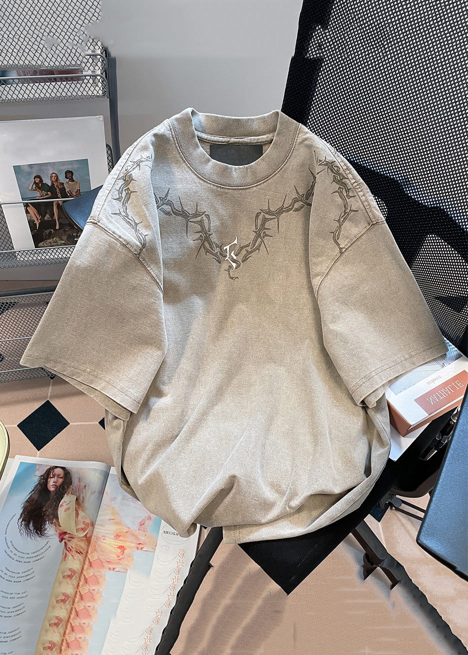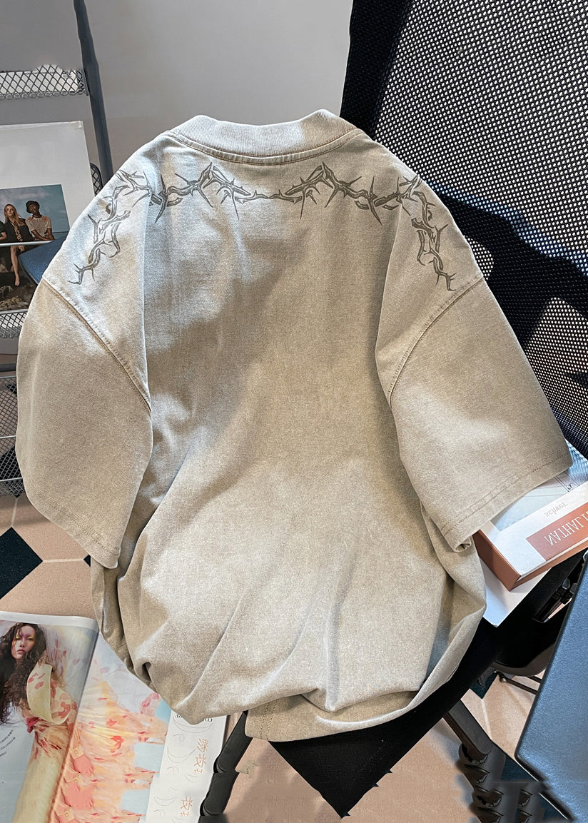 Vintage Khaki O Neck Print Solid Cotton Mens T shirt Summer YL006