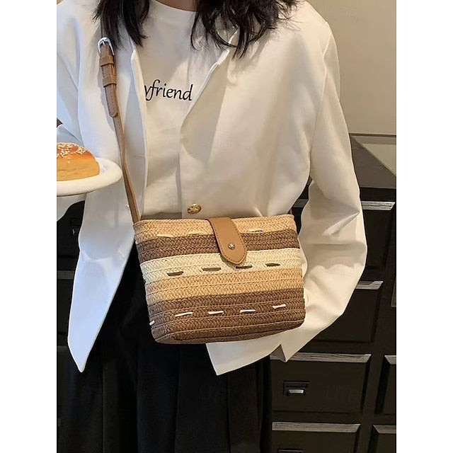 Gender: Women's, Type: Crossbody Bag, Shoulder Bags, Material: Straw, Embellishment: Zipper, Pattern: Woven, Striped, Detachable strap: Non-Detachable, Adjustable strap: Adjustable, Occasion: Beach, Casual Daily, Casual, Holiday, Width (cm): 6, Height (cm): 16, Length (cm): 23, Function: Lightweight, Category: Crossbody Bag,