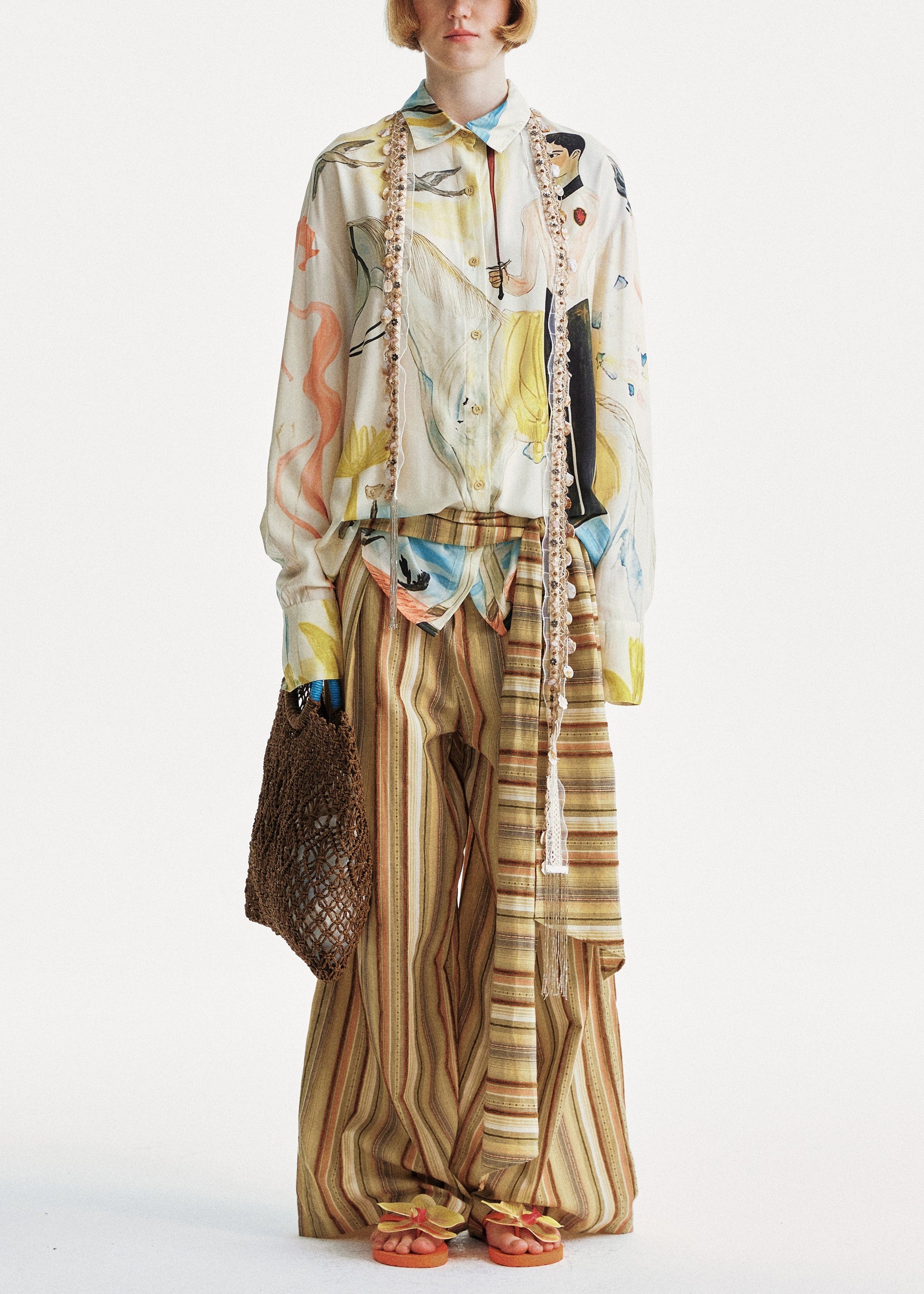 Yellow Cotton Summer Striped Pants Chic Leg Wide
