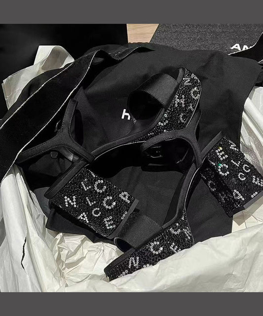 Boutique Schwarze Sandalen mit Blockabsatz und Peep Toe, Buchstaben-Zirkon-Design OI027