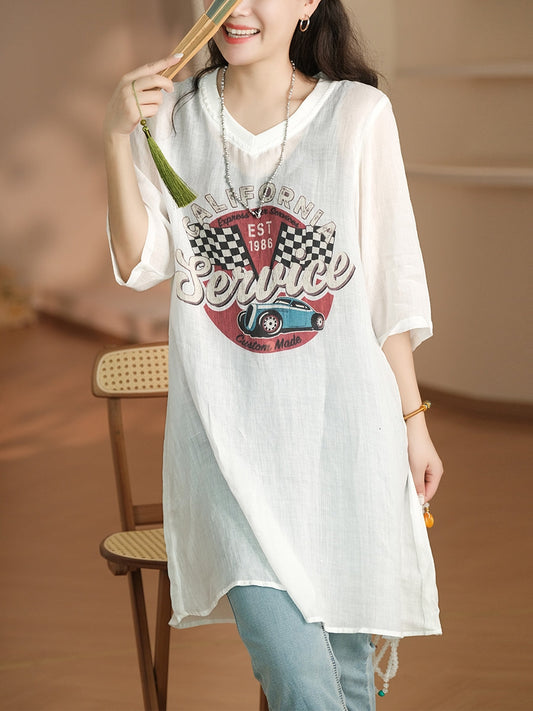Damen Sommer Casual Print V-Ausschnitt Ramie Longshirt LL022
