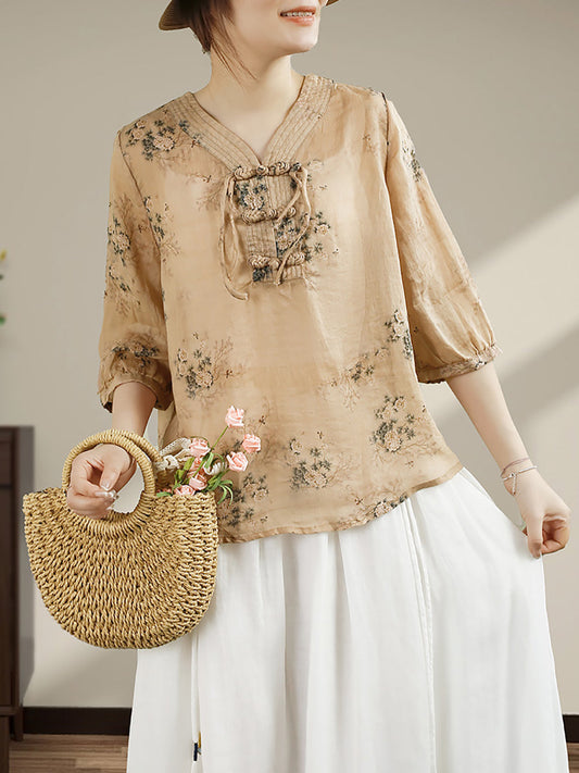 Frauen Sommer Vintage Blume Schnalle V-Ausschnitt Ramie Shirt HH014
