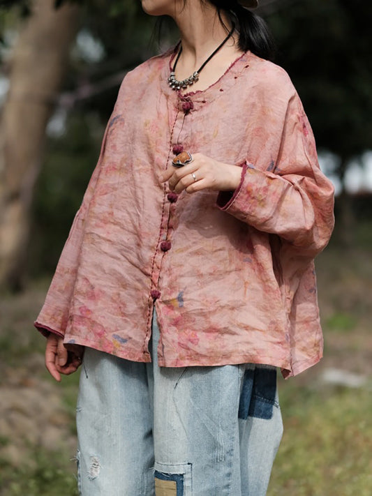 Frauen Sommer Vintage Blume Knopf Ramie Lose Hemd HH036
