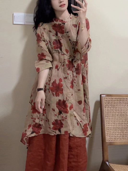 Damen Sommer Vintage Blumen Button-up Leinen Longshirt OP1034