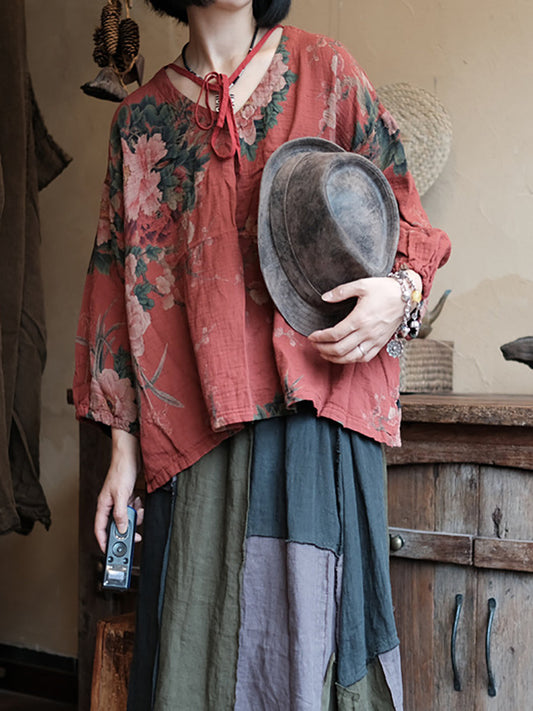 Damen Sommer Vintage Blumen Gespleißtes V-Ausschnitt Ramie Shirt OP1036