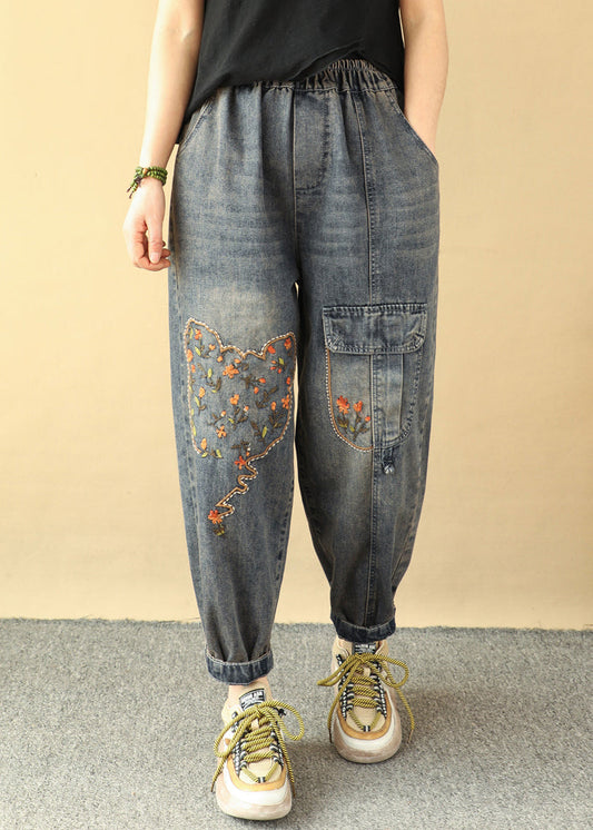 Lose blaue bestickte Taschen elastische Taille Denim Hose Frühling QQ1018