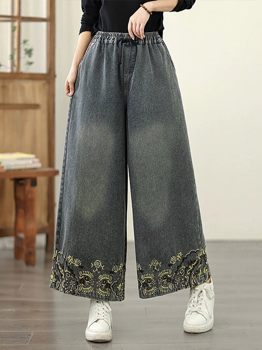 Embroidery Women Retro Autumn Denim Wide-leg Pants
