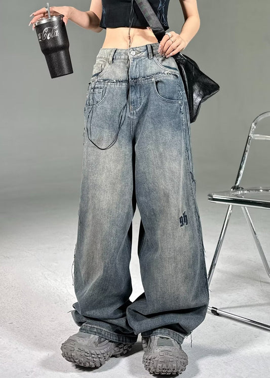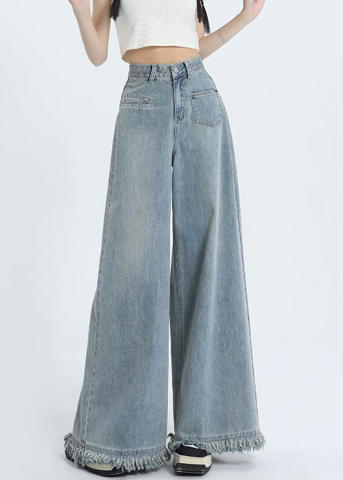 Moderne blaue Jeanshose mit hoher Taille und weitem Bein und Troddeln, Herbst AW1003