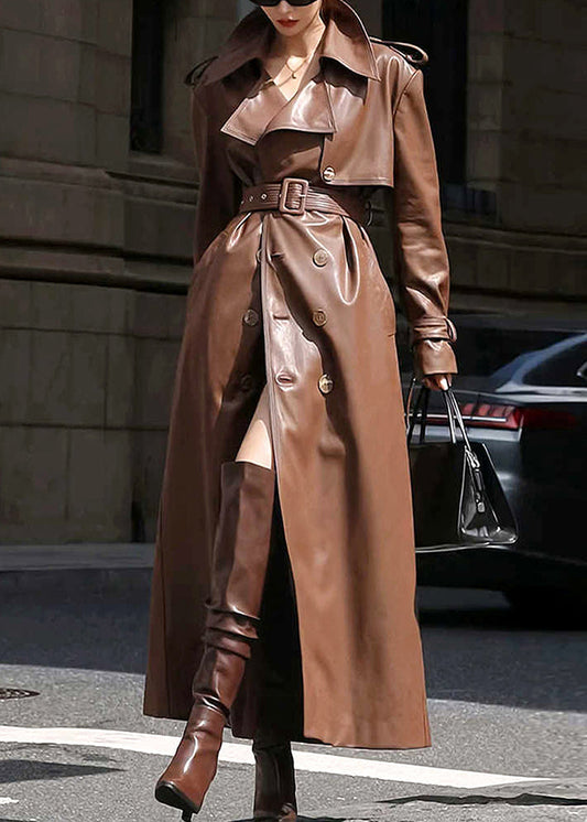 French Coffee Notched Button Faux Leather Long Trench Coat Winter RY002