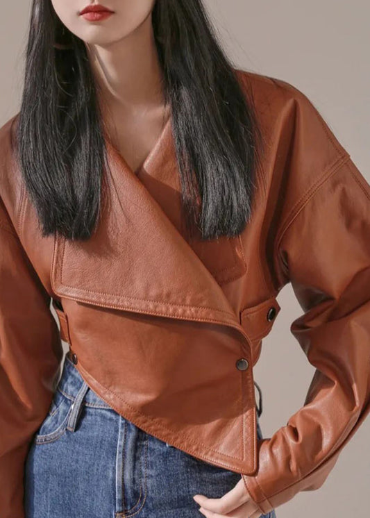 Style Brown Asymmetrical Patchwork Faux Leather Short Coat Fall RY008