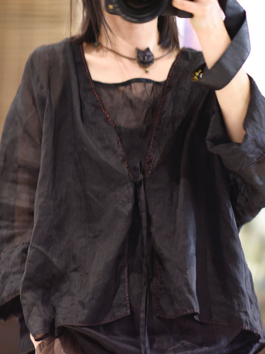 Pure Shirt Women V-Neck Ramie Summer Vintage Color