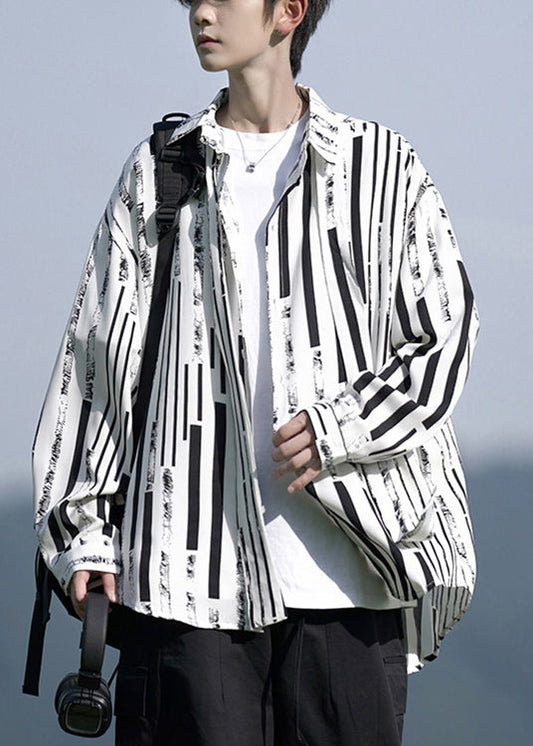 Button Silk Mens Shirt Striped Ice Chic Bracelet Sleeve Apricot