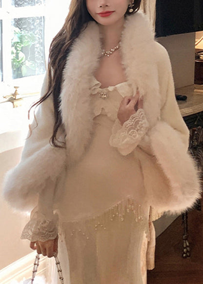 Elegant White Fur Collar Coat And Dress Fluffy Two Pieces Set Flare Sleeve YW004